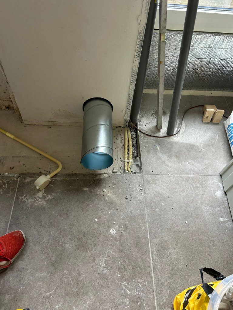 We merken dat het steeds populairder wordt. Een gat bijna op de tegelvloer, zodat de afzuiging van de kookplaat erop aangesloten kan worden.