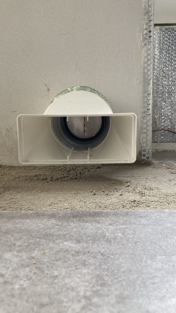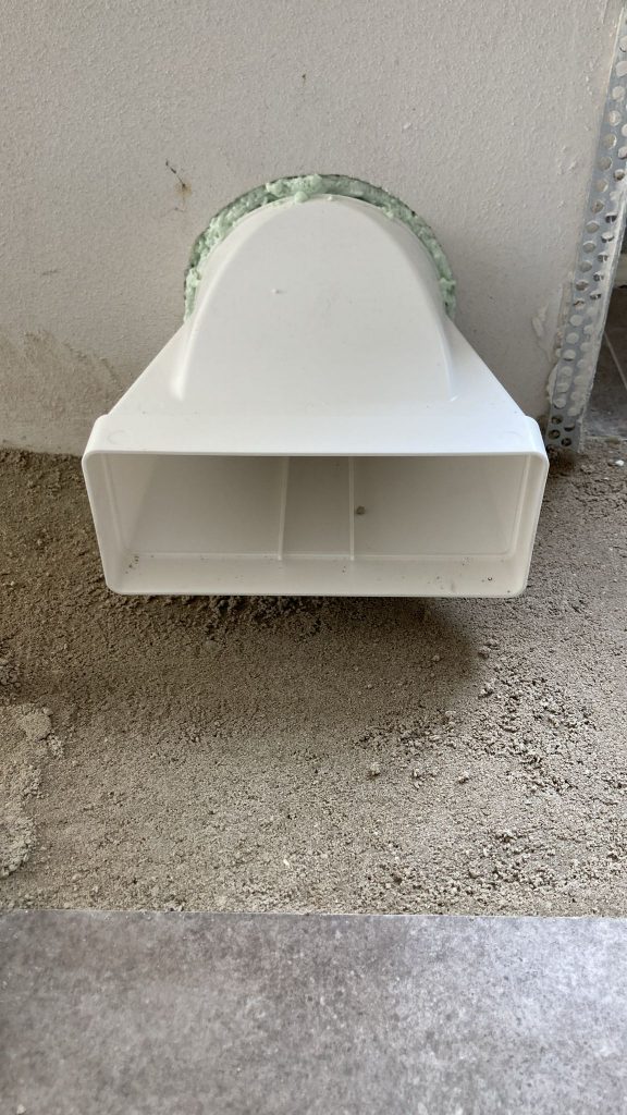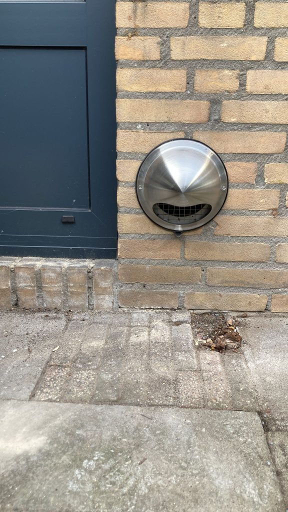 Qua afwerking Spiro buis, met aan de buitenkant een RVS bolrooster en binnen een rechthoekig kunstof verloop geplaatst.